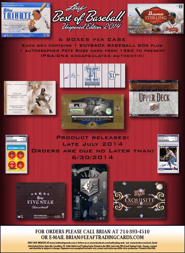 2014 Leaf Best of Baseball: Unopened Edition is comprised of an incredible assortment of unopened baseball boxes spanning the past 30 years. In addition, each and every box will include a PSA/DNA encapsulated authentic Pete Rose autograph ranging from 1963 Topps Rookie cards to difficult to find 1960�s and 1970�s releases and well as 1980�s and beyond issues. This is sure to add value for all types of collectors!