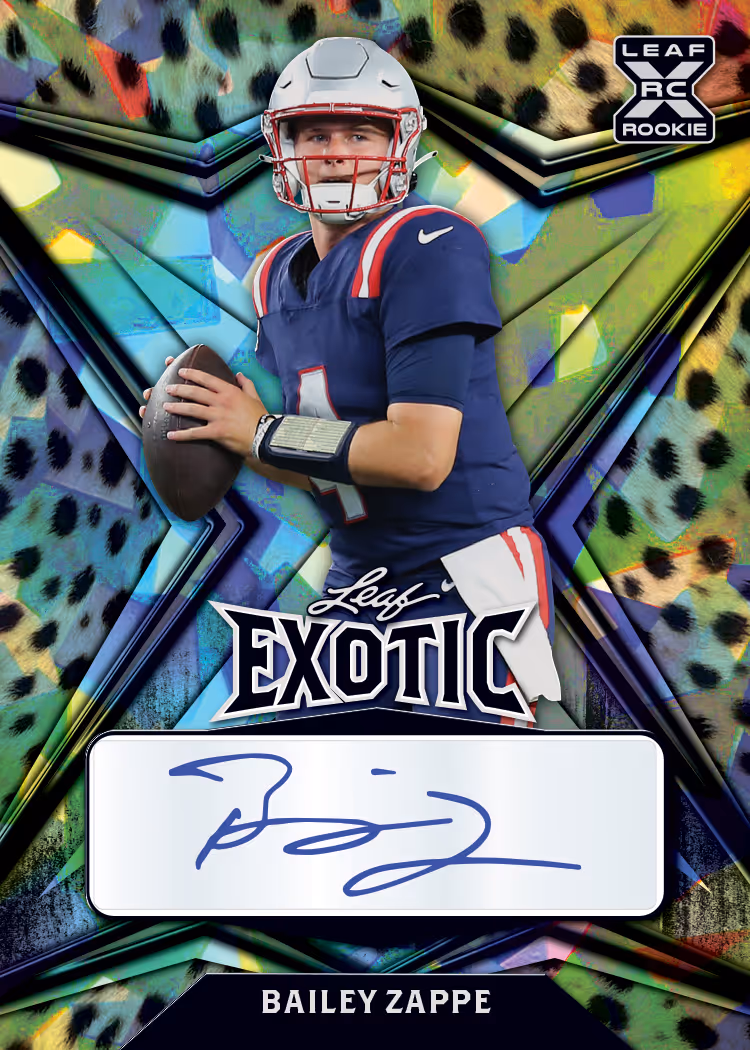 Leaf is excited to bring wild and exotic designs to its 2022 football product line with 2022 Leaf Exotic Football Hobby Everyone knows how collectors love the animal print parallels and exotic brings a wild selection including: Tiger, Snakeskin, Zebra, Peacock, Giraffe, Snow Leopard, Elephant, Giraffe, Butterfly and more!