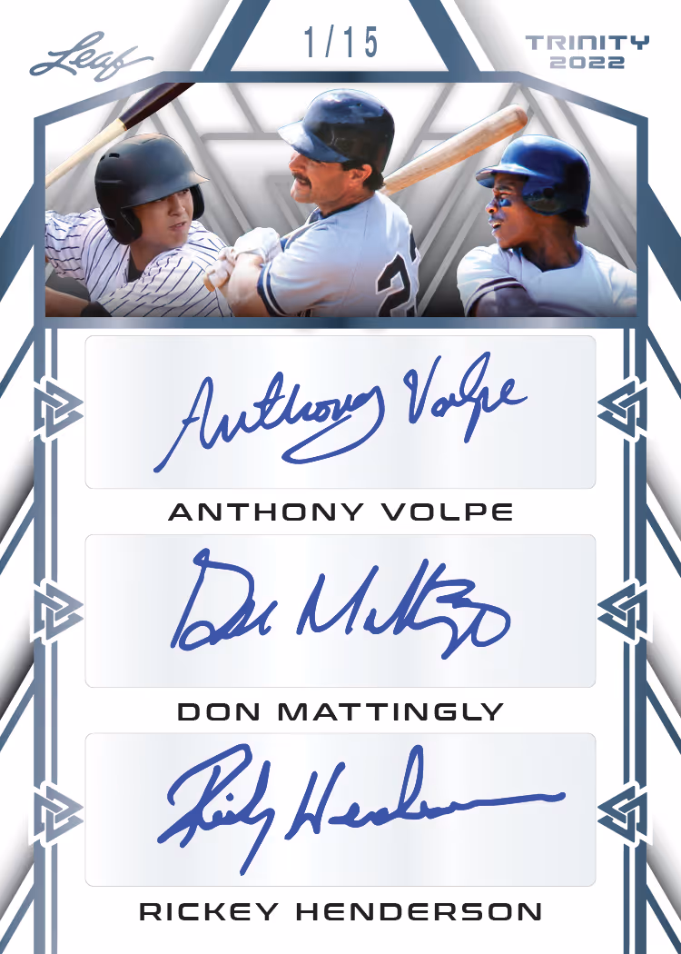 Leaf Is Excited To Announce The Return Of 2022 Leaf Trinity Baseball! Not only will you find popular Trinity autographs including Clear Autographs and Autograph patches, but you can also look for the addition of the new Dual Auto, Triple Auto and 1-of-1 Logoman Autographs. The autograph checklist include an impressive list of legends, superstars and prospects including Ichiro, Frank Thomas, Ronald Acuna Jr., Druw Jones, Anthony Volpe, and more!