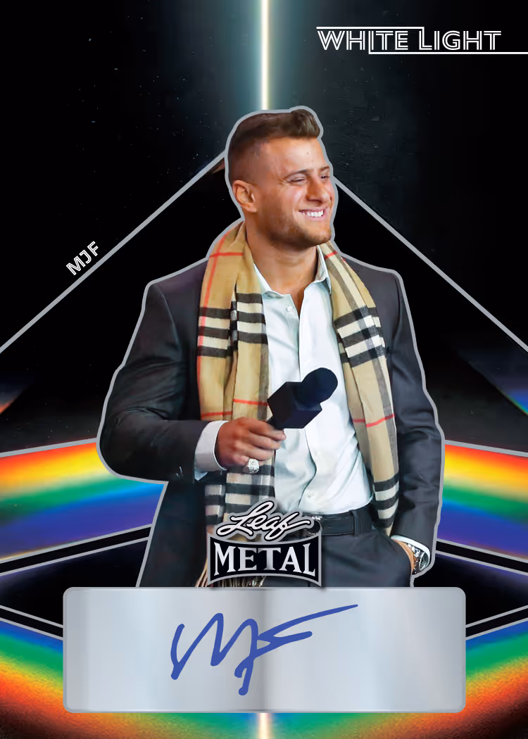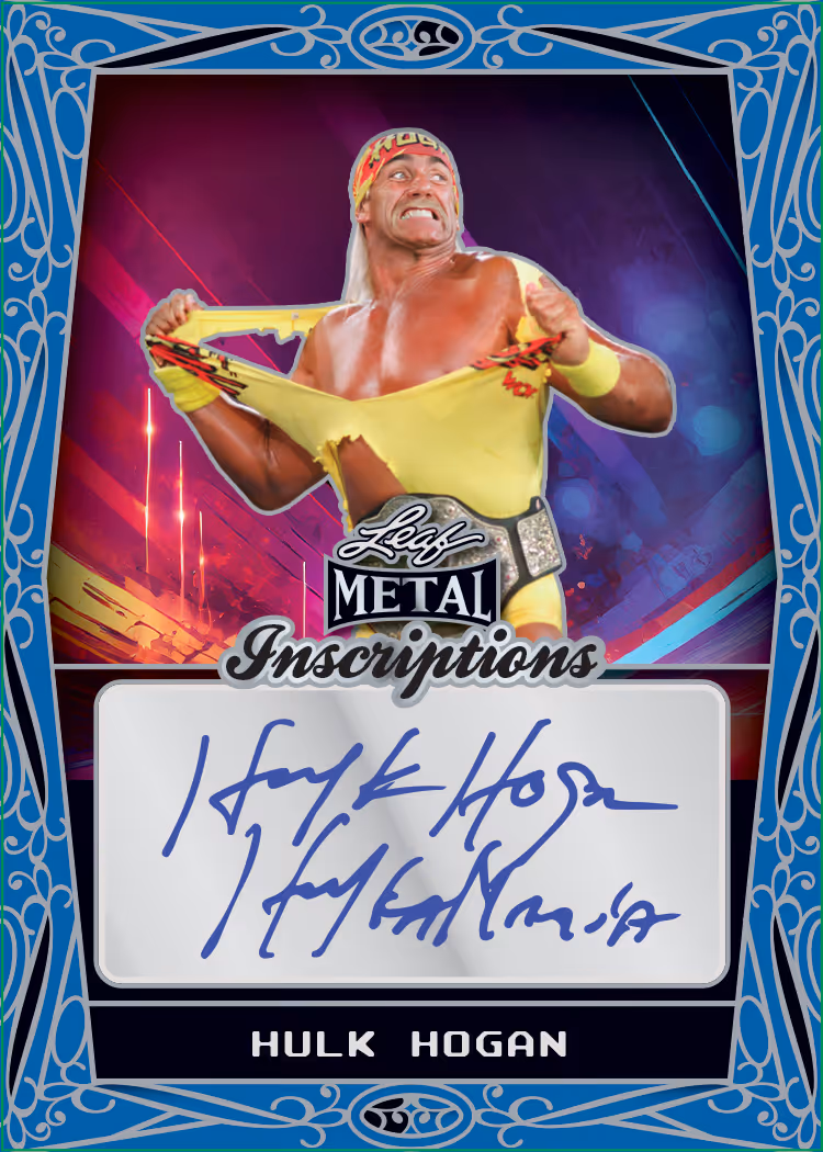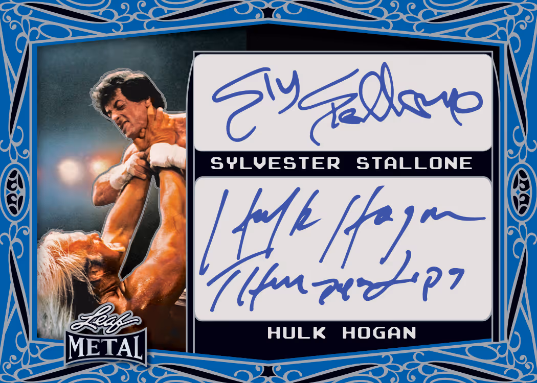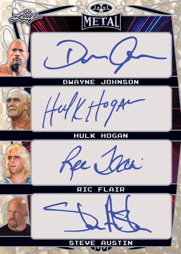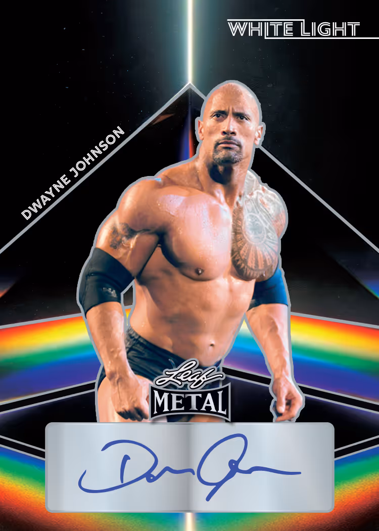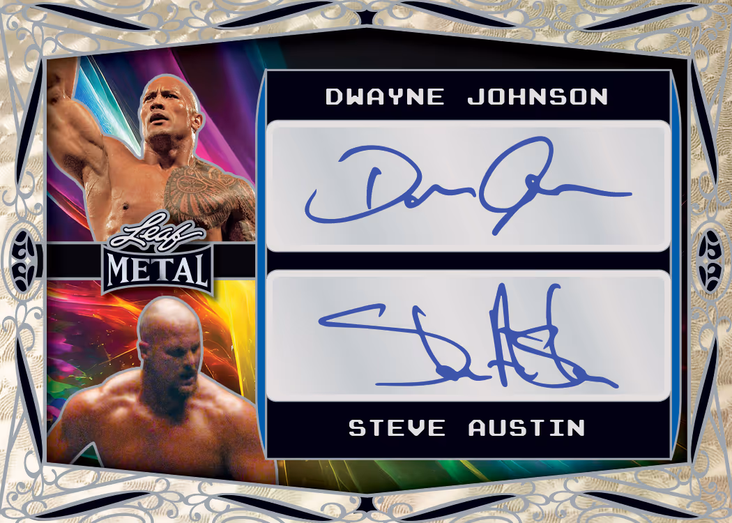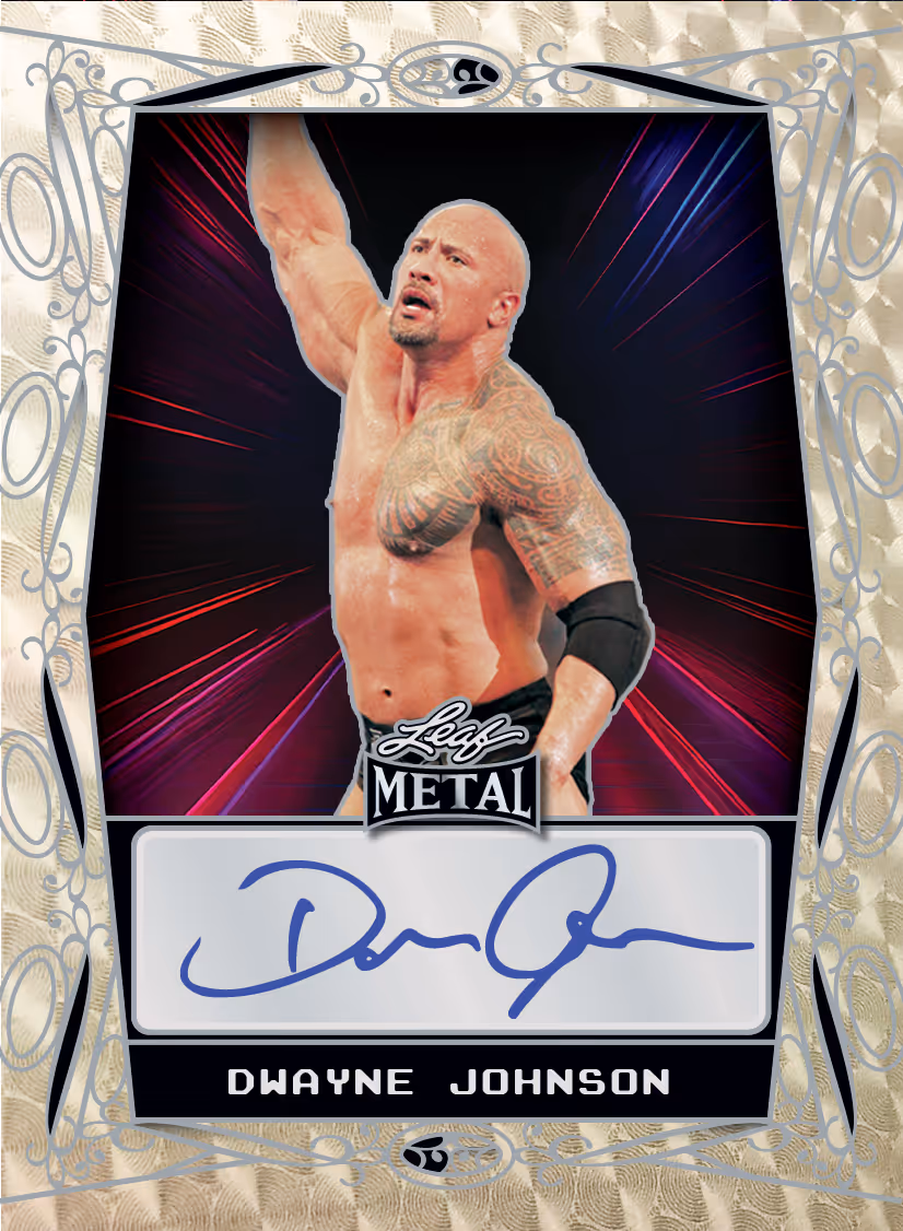 DO YOU SMELL WHAT LEAF IS COOKING? Leaf Trading Cards is proud to invite you ringside to participate in one of the most exciting Wrestling products ever produced with 2024 Leaf Metal Legends Wrestling! THAT'S NOT ALL! Leaf Trading Cards has secured signatures from Dwayne Johnson!! His first certified autograph in years! Look for signatures from Wrestling Legends such as Ric Flair, Hulk Hogan, Steve Austin, John Cena and MJF! Also look for multi-signed featuring all of the above plus Sylvester Stallone, Floyd Mayweather and Shaquille O'Neal!! Every card is numbered to 10 or less!!