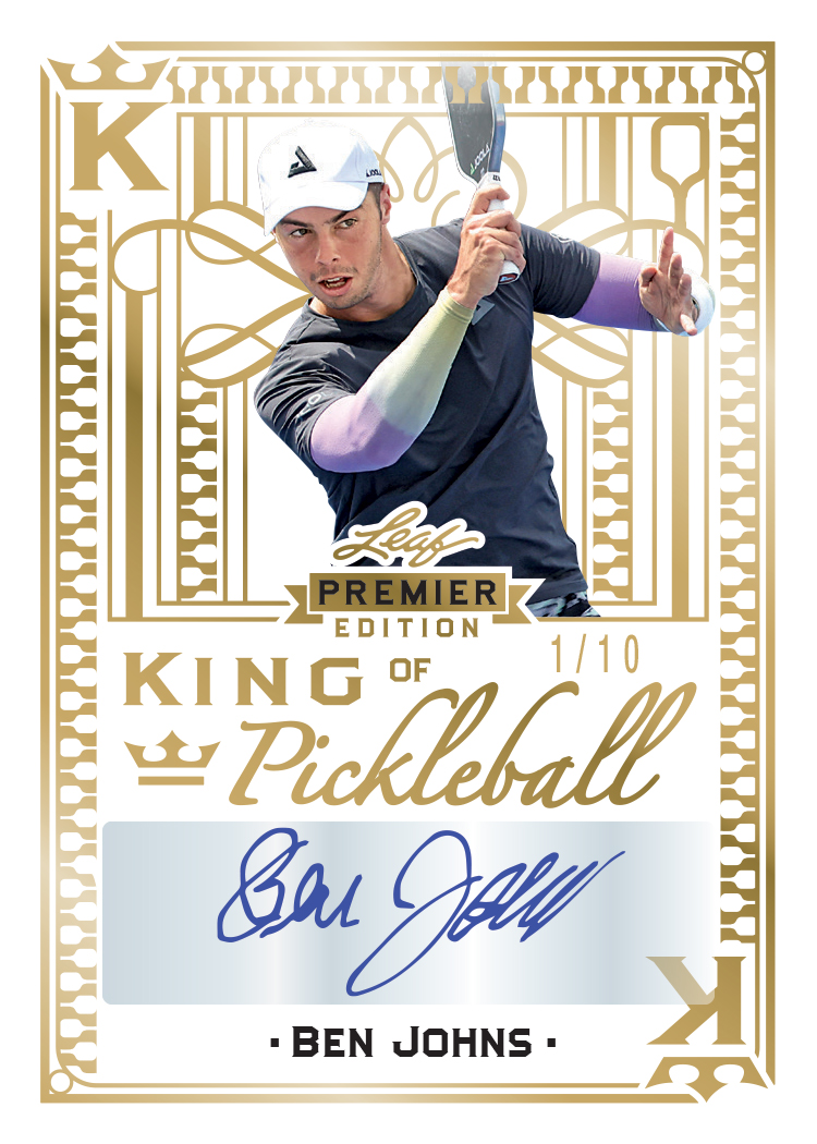 Leaf is proud to announce the first ever Pickleball trading card set! Leaf Pickleball Premier Edition brings you the best players and biggest names from the world’s fastest growing sport! Pickleball Premier Edition will feature some of the first ever trading cards of top men and women players as well as autographs from the world of Pickleball! Be on the lookout for the extremely rare King and Queen of Pickleball Autographs featuring Ben Johns and Anna Leigh Waters! You can also find a variety of rookie cards, numbered foil parallel cards and autograph cards. Every 5 card box will include one base foil color parallel numbered to 30 or less PLUS one autograph card numbered to 30 or less!