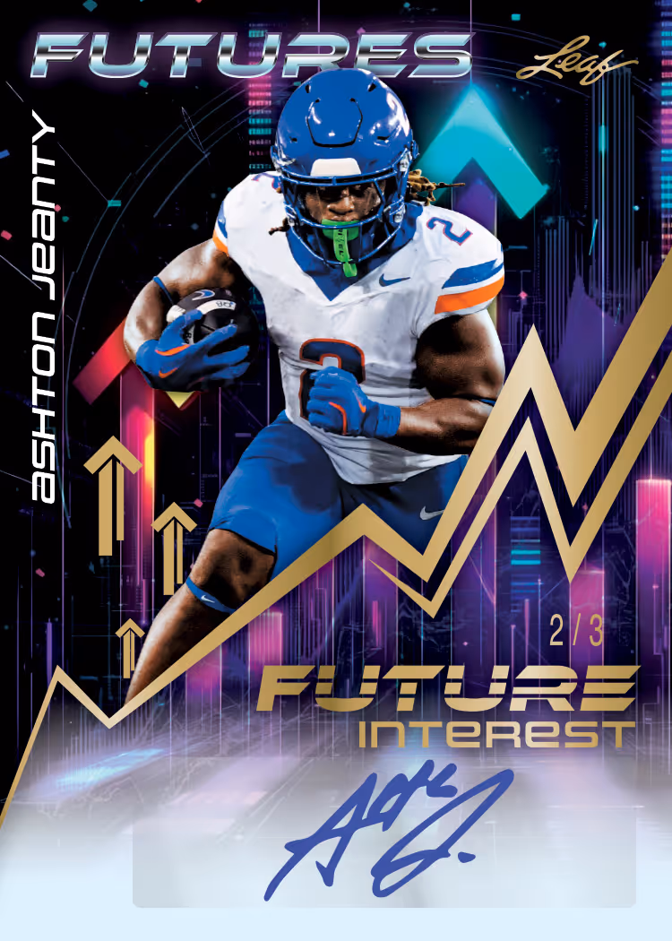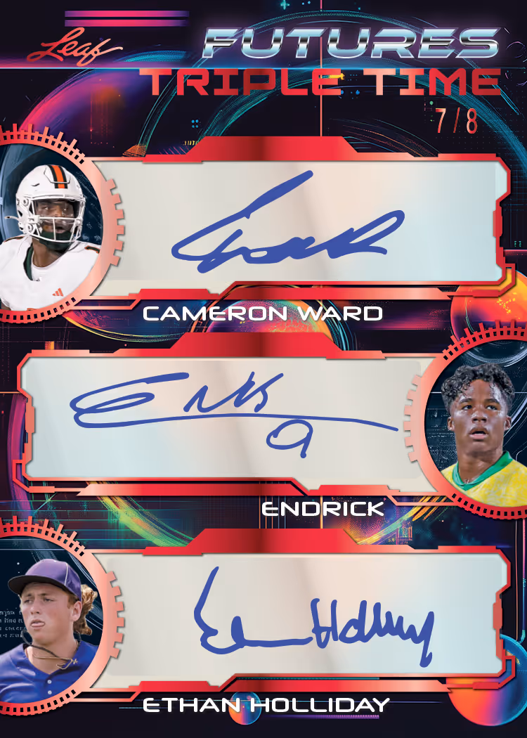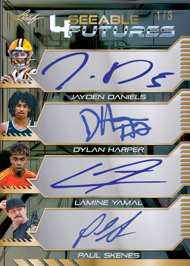 Meet the future of sports in a way only Leaf can bring you! Each 2024 Leaf Futures Multi-Sport Box contains 6 packs with 3 Base/Parallels and 1 Autograph per pack Each 2024 Leaf Futures Blaster contains 8 Base, 2 Foil inserts and 1 Autograph per box Look for Autograph insert cards limited to 25 copies or less! Find Dual, Triple and Quad autograph cards combining the top prospects from Baseball, Football, Basketball, Soccer, and more! The checklist is stacked with young superstars including Jayden Daniels, Carlos Alcaraz, Lamine Yamal, Cameron Brink, Travis Bazzana, and so much more!