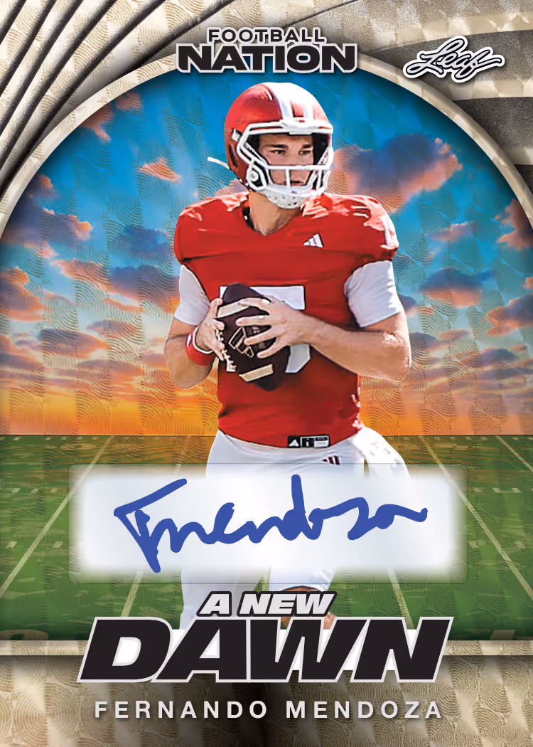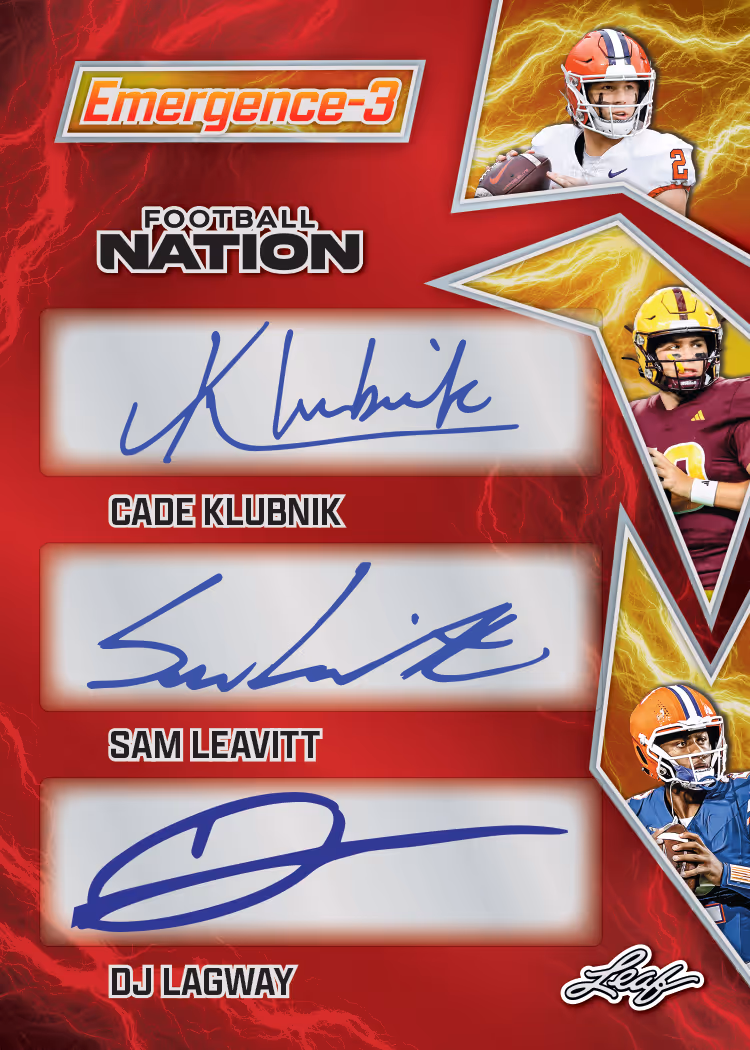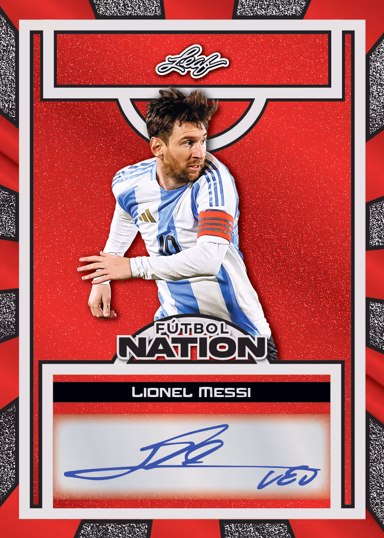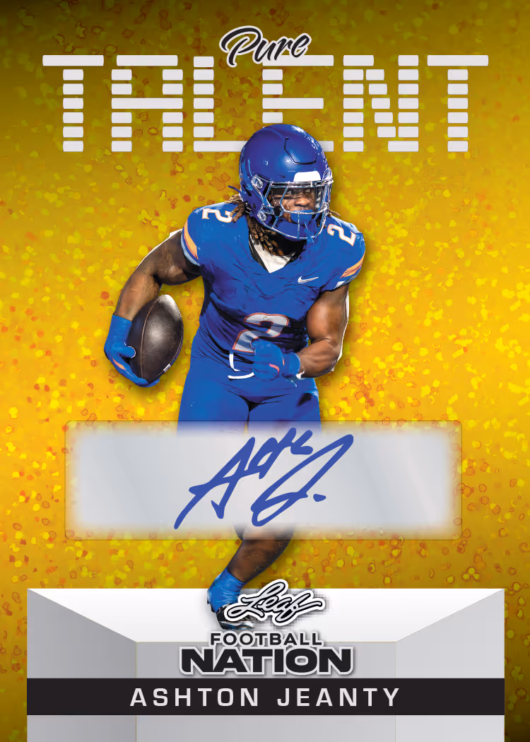 Look for 1 multi-sign cards in every hobby and jumbo case. Look for 1 - 2 Fútbol Nation Autograph cards per Jumbo case featuring soccer legneds such as: Lionel Messi, Cristiano Ronaldo, Neymar Jr., Phil Foden, Ronaldo Nazario, and many more. Look for 5 signatures per case from the following amazing list: Ashton Jeanty, Bo Jackson, Cade Klubnik, Cameron Skattebo, Demond Williams Jr., DJ Lagway, Emmitt Smith, Fernando Mendoza, Isaac TeSlaa, Jeremiyah Love, John Elway, John Mateer, Lamar “Bo” Jackson, LaNorris Sellers, Omarion Hampton, Sawyer Robertson. Look for an astounding array of exciting multi-signed cards featuring Yesterday’s Legends and Tomorrow’s Stars.