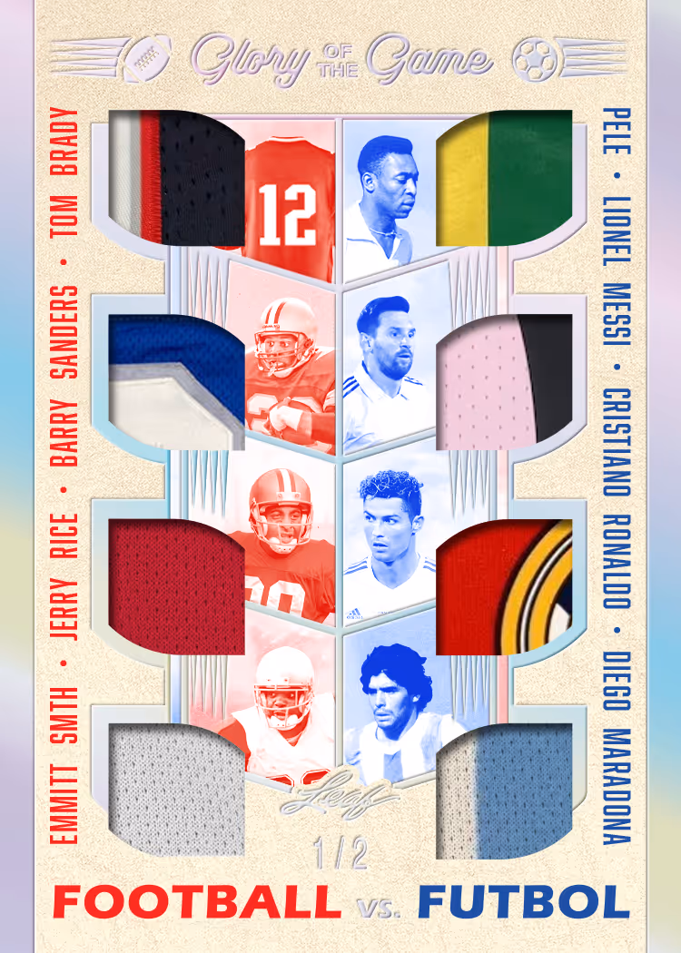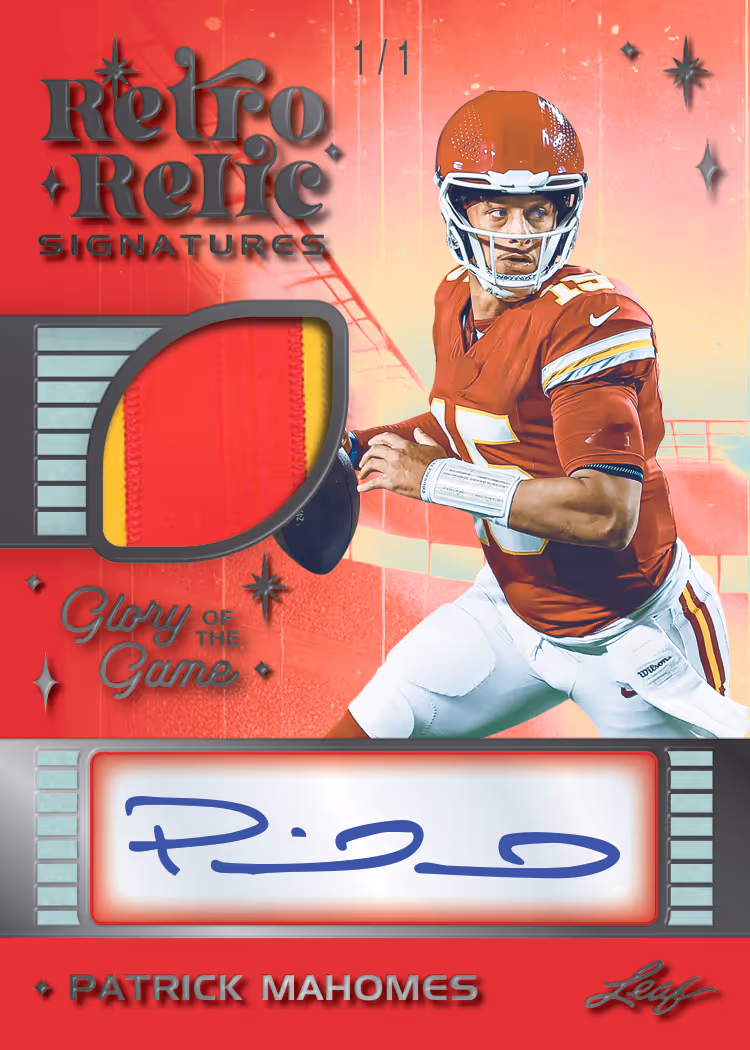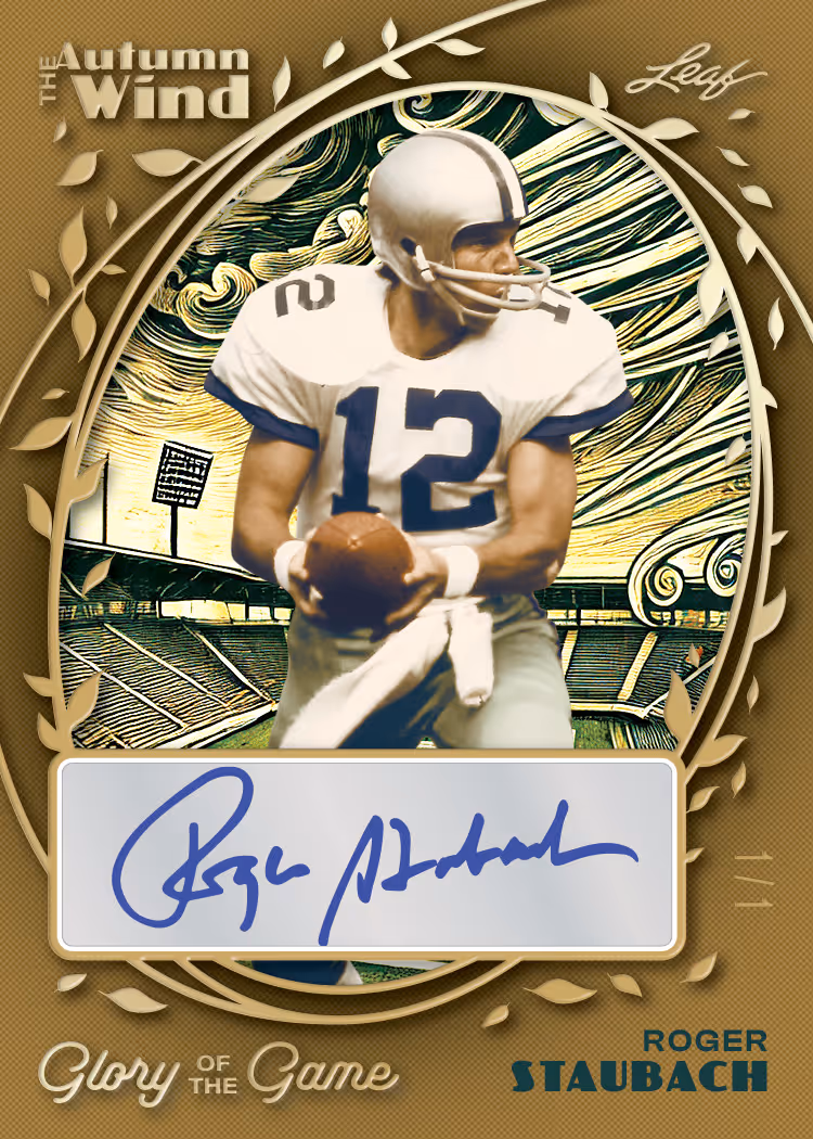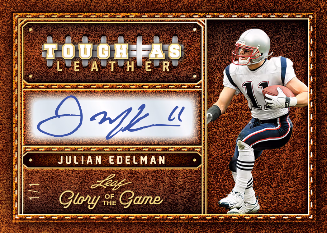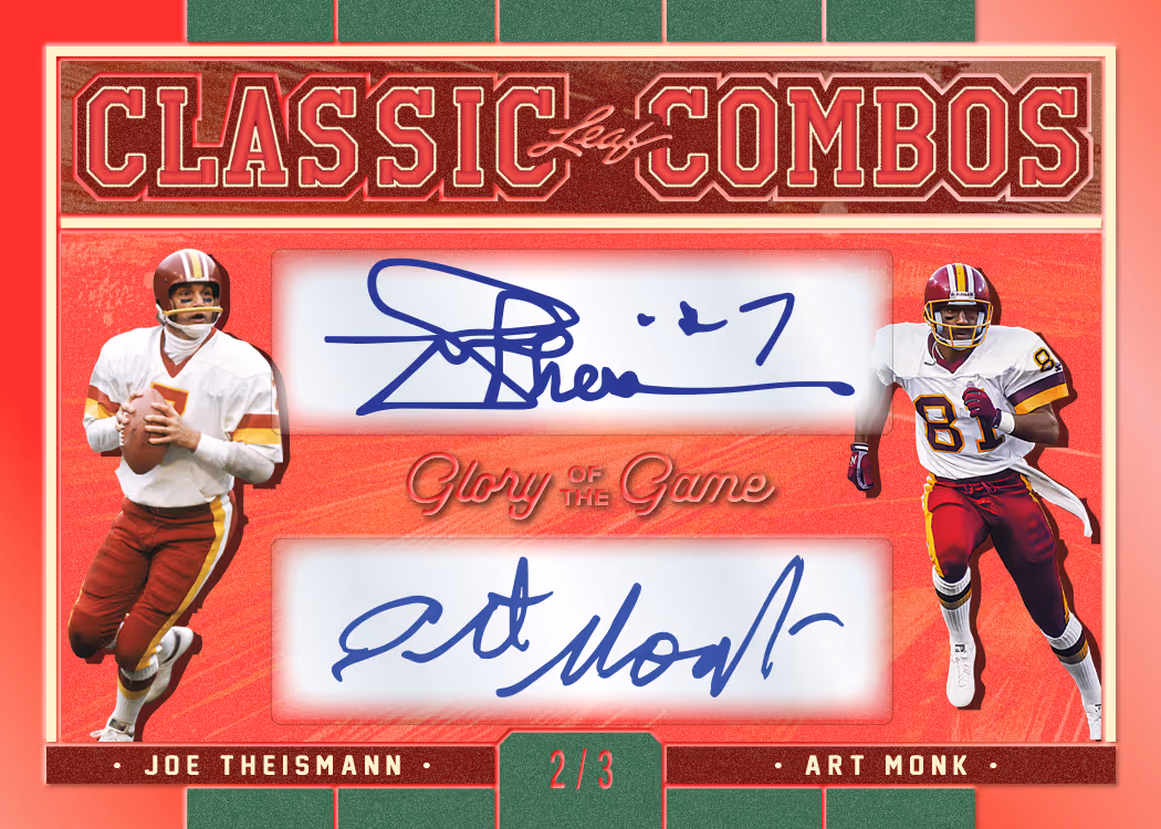 Classic Combos offers up some awesome dual signature cards featuring combo such as: Peyton Manning & Dan Marino, Justin Jefferson & Ja’Marr Chase, Mike Singletary & Lance Briggs, and more. Tough as Leather inserts are featured on a tough leather substrate. No other company can offer the amazing variety of game-used memorabilia that Leaf Trading Cards provides in 2025 Leaf Glory of the Game Football. Look for highly collectible and visually appealing themed inserts such as Retro Relic Signatures, Canton Cuts, and The Autumn Wind. Canton Cuts will feature 1-of-1 cut signatures of football royalty Vince Lombardi, Walter Payton, Tom Brady, and many more.