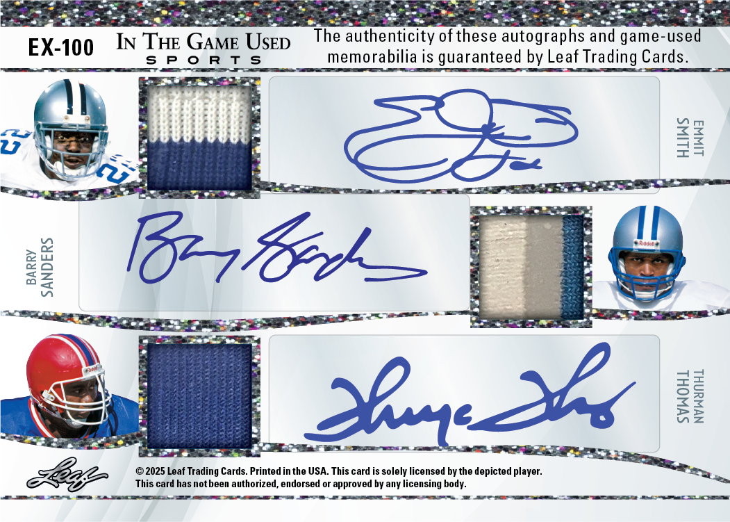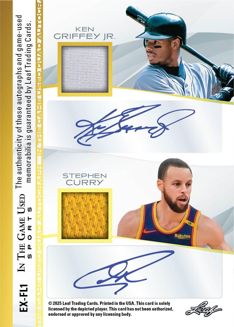 Leaf Trading Cards is proud to announce the return of one of the industry’s premier memorabilia-driven products with 2025 Leaf In The Game Used Sports. This latest release continues the tradition of delivering a product built around premium game-used content and collectible appeal. Look for an impressive spectrum of athletes, featuring everyone from today’s top young prospects to some of the greatest legends in sports history. As the hobby has come to expect, In The Game Used delivers an outstanding selection of autographed memorabilia cards, including a strong lineup of multi-signed memorabilia cards. Look for an impressive array of double-front, multi-signed game-used memorabilia cards, continuing the tradition of showcasing an all-time lineup of the greatest athletes the world has ever seen.