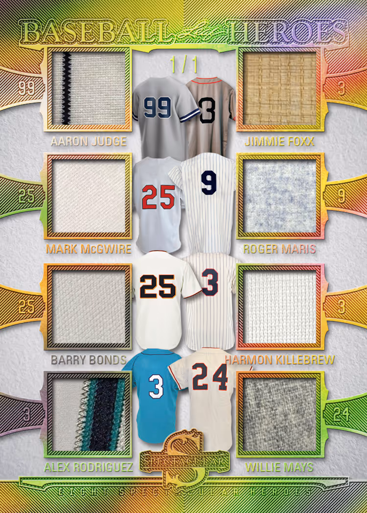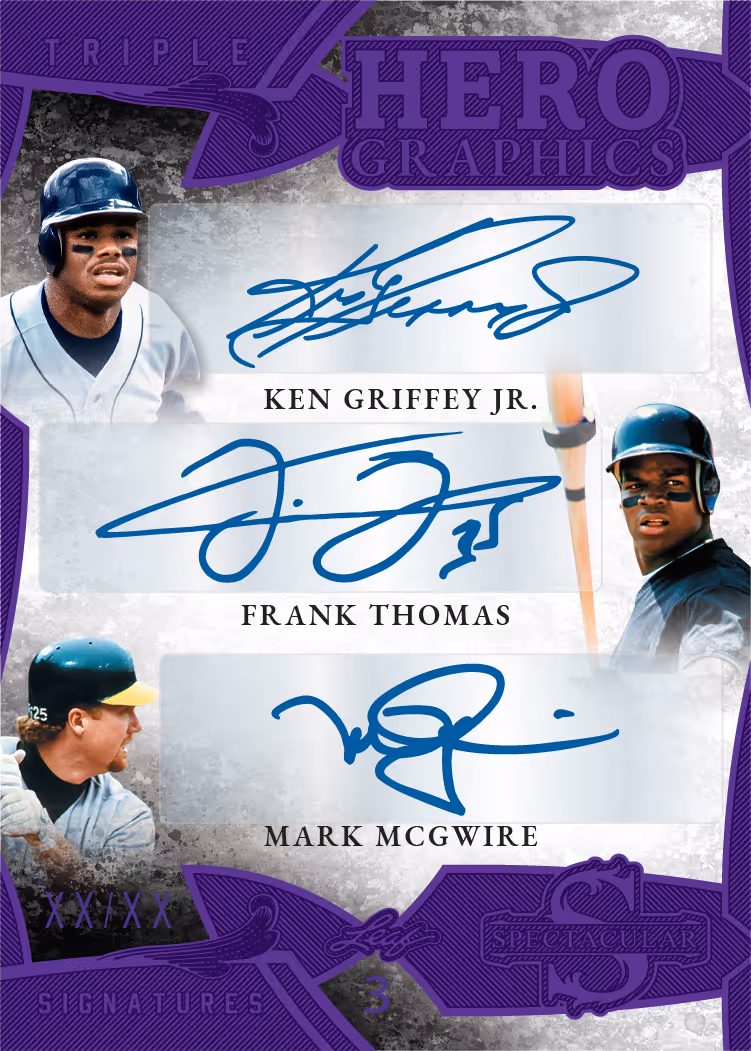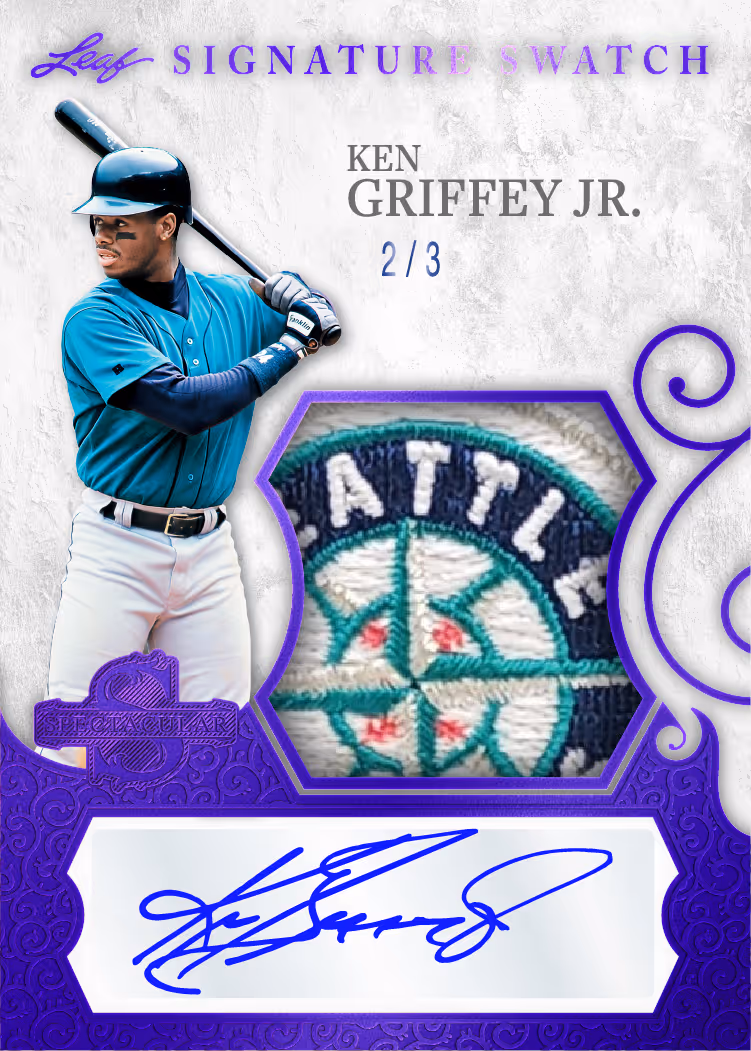 2025 Leaf Spectacular Baseball is set to live up to its name, delivering a high-impact content that’s as impressive as it is memorable. Look for game-used memorabilia from the legends who defined baseball history, including Babe Ruth, Lou Gehrig, Ty Cobb, Willie Mays, Mickey Mantle, Joe DiMaggio, Ted Williams, Eddie Collins, and many more. Find two to three multi-signed cards in every three-box case, along with autographs from some of baseball’s most iconic names such as Ken Griffey Jr., Nolan Ryan, Bo Jackson, Carl Yastrzemski, Don Mattingly, Ichiro, Pete Rose, Rickey Henderson, and others.