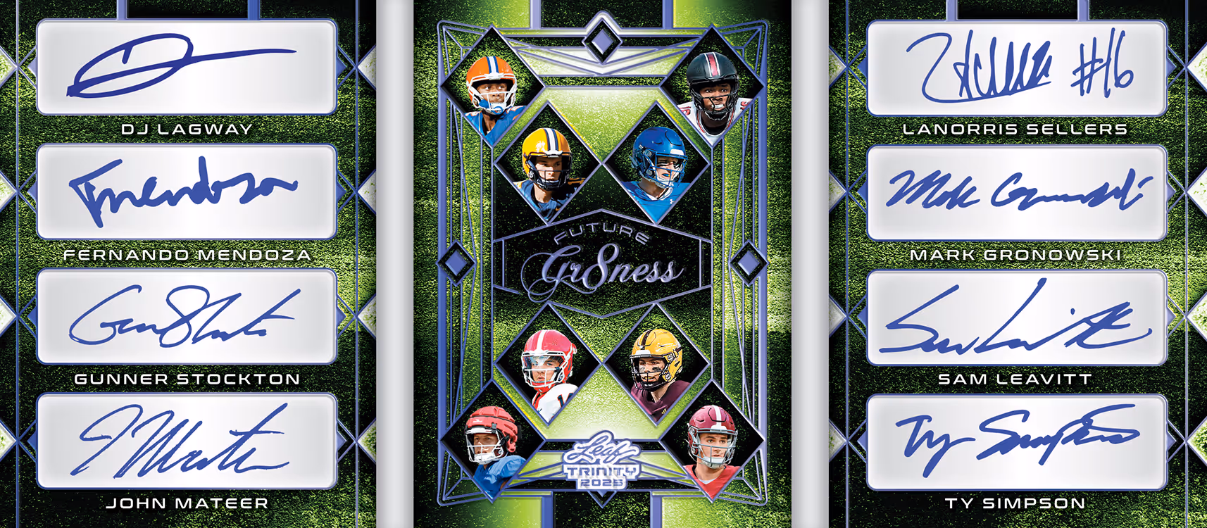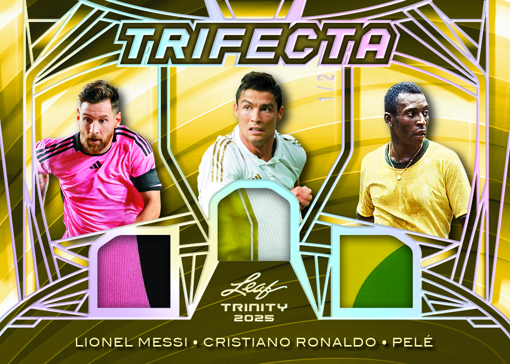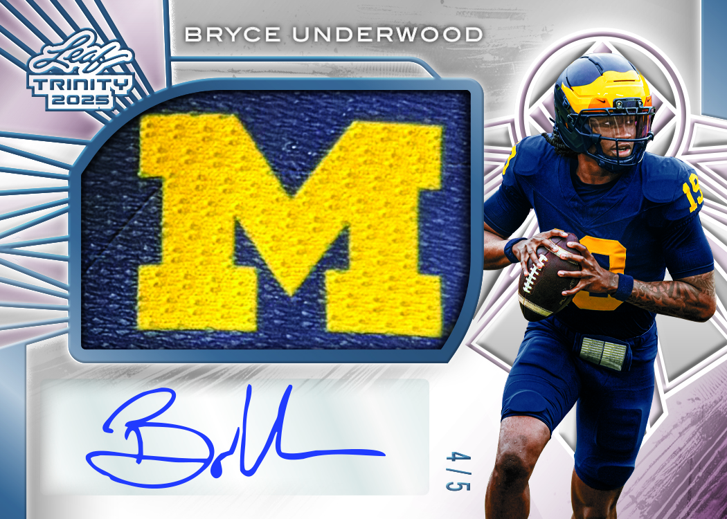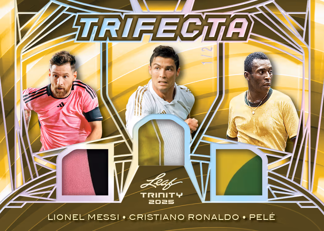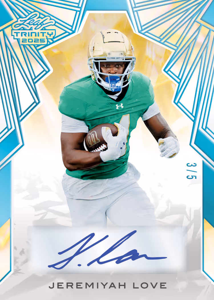 Look for 3 signatures from the following names in each case: Ashton Jeanty, Bryce Underwood, DJ Lagway, Jeremiyah Love, LaNorris Sellers, Omarion Hampton, Sam Leavitt, Barry Sanders, Emmitt Smith, John Elway, Randy Moss, Patrick Mahomes, and Roger Staubach. Look for at least 3 multi-signed cards in every case. Look for Hobby only (1 per box) Metal Autograph Memorabilia Cards. Look for Jumbo only (1 per box) Trinity Multi-Sport Cards Featuring names like: Lionel Messi, Ken Griffey Jr., Giannis Antetokounmpo, and many more.