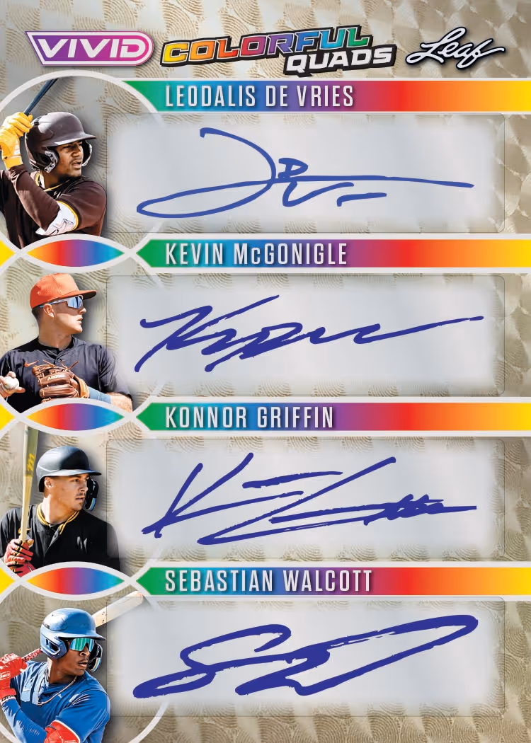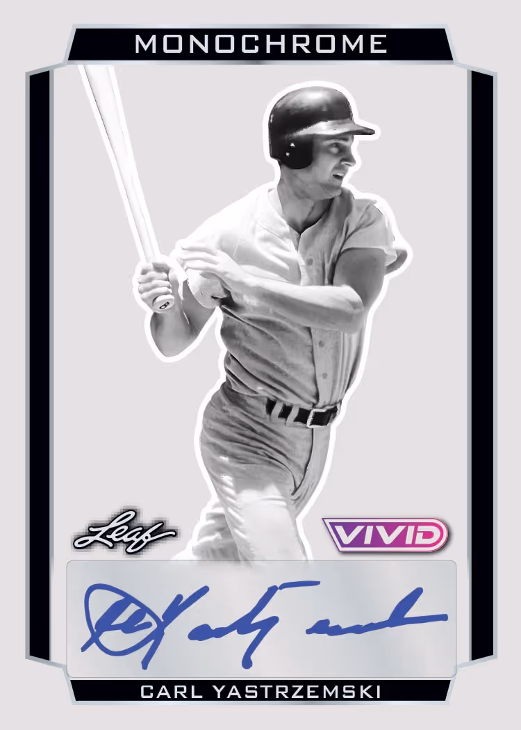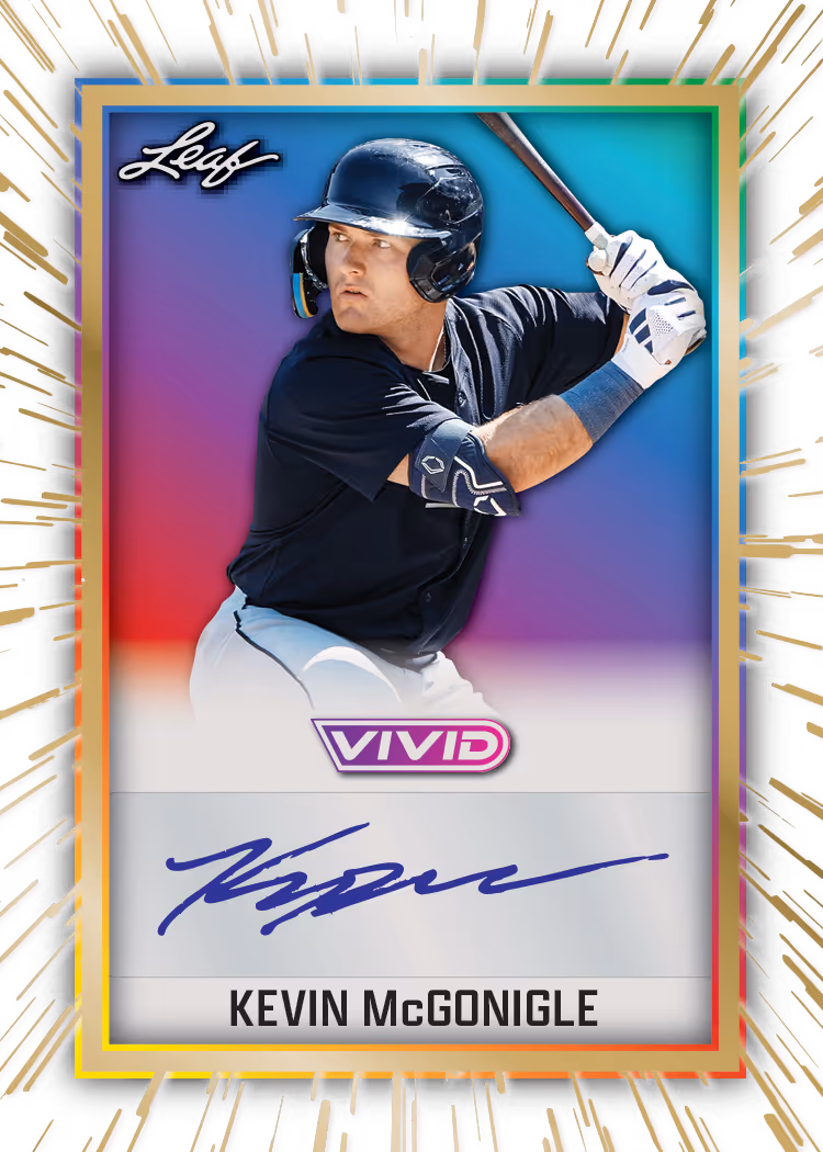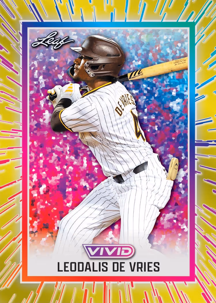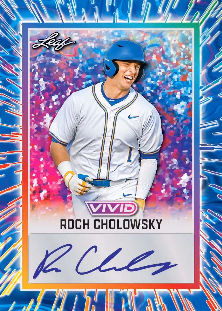 Hobby gets 1 Vivid Monochrome card per case and Jumbo gets 1 Vivid Clear card per case. 4 to 5 multi-signed cards per case. 4 to 5 autograph cards per case from the following names: Charlie Condon, Josue De Paula, Kevin McGonigle, Konnor Griffin, Leodalis De Vries, Roch Cholowsky, Travis Bazzana, Ken Griffey Jr., Carl Yastrzemski, Lionel Messi, Nolan Ryan. All base cards are numbered 1/1.