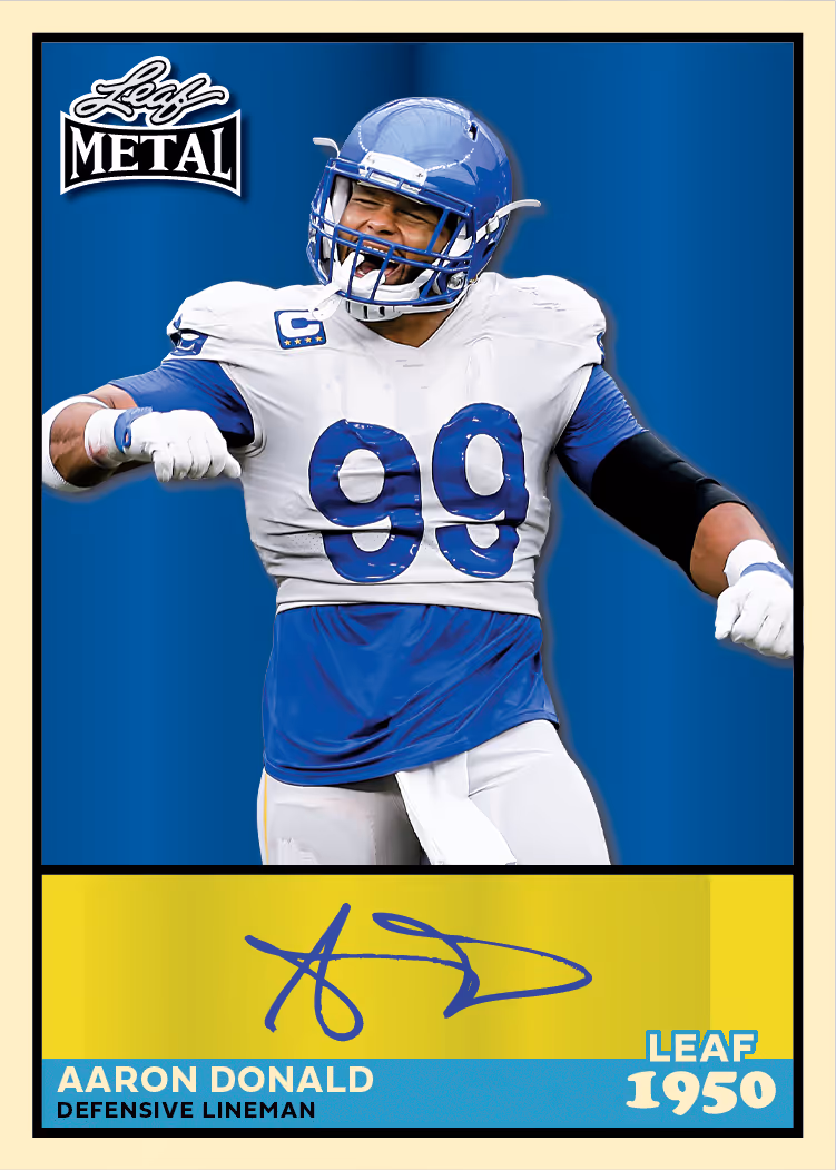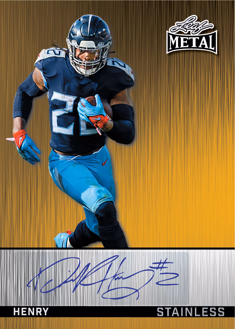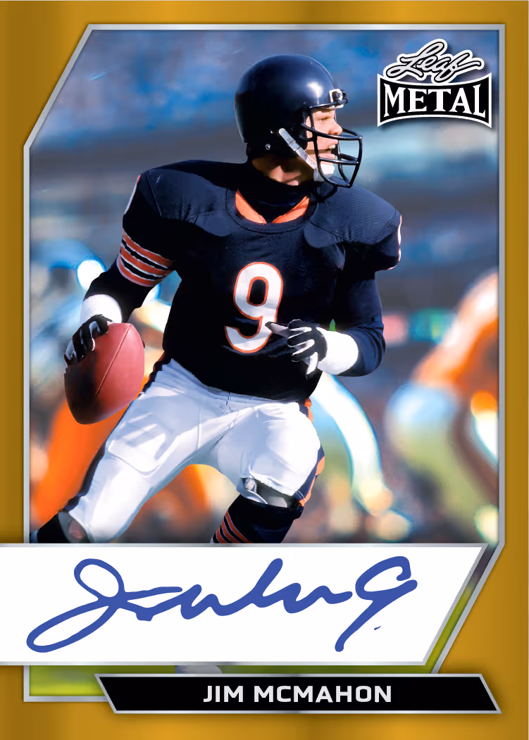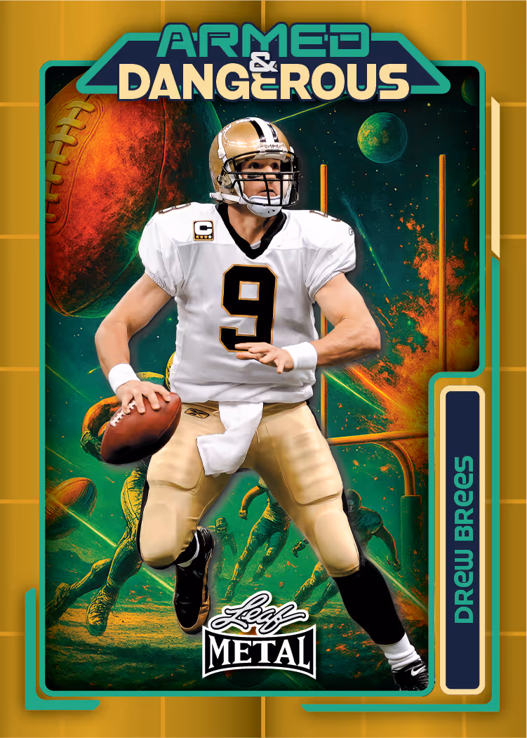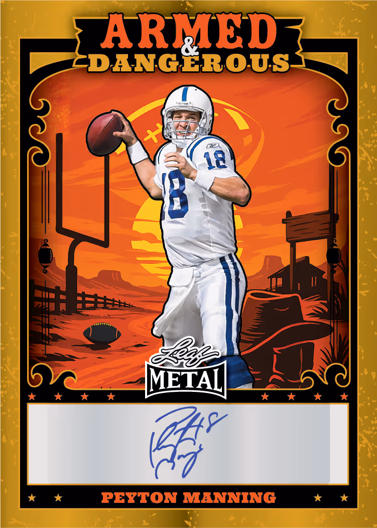 Look for bold new themes in 2026 Leaf Metal Football, highlighted by dynamic designs and premium content, including on-card signature cards that fall once per box. Exciting new Armed and Dangerous insert, featuring three different action pack backgrounds that bring added intensity and visual impact to the lineup.