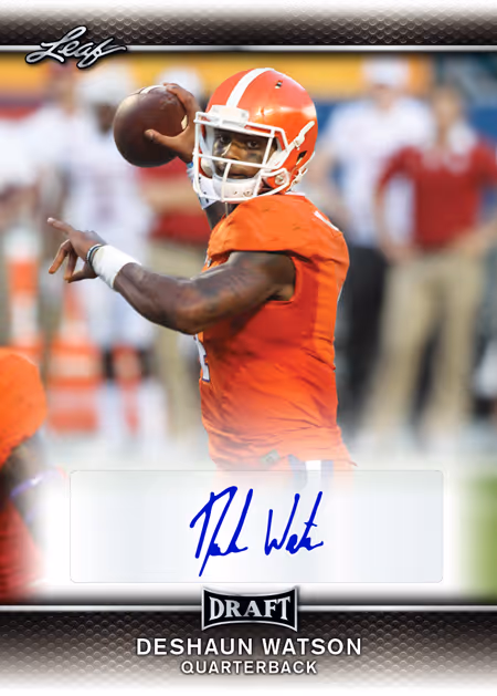 2017 Leaf Draft Football Retail is a pack product sold through mass retail. It includes players from the 2017 NFL Draft. The blaster box contains 20 packs with 2 autograph cards in top-load holders (not in packs!!). Each pack contains five cards. Look for many short-print autos and Gold Parallels of the base and autograph cards. Stated print run for Gold autograph parallel cards is less than 150 per player.